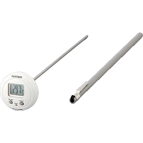 アズワン(株) 品番:2-7673-02 AS 防滴ペン型温度計 CT-414WR 特長表示が上向きで見やすいです。用途測定範囲:-10~+220℃測定精度:-10~+40℃/±1℃分解能:-10~199.9℃/0.1℃、200~220℃/1℃本体サイズ:φ46.5×37mmセンサーサイズ:φ3.5×245mm重量(電池含む):約31g電源:LR44ボタン電池1.5×1個(別売)