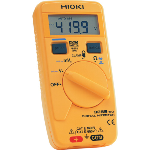 日置電機(株) 品番:3255-50 HIOKI デジタルハイテスタ 特長プローブの差し替え不要の2端子構造です。防塵・防水構造です。(IP54)ACクランプ(9132-50:別売)使用時の最大交流電流測定値は1000Aです。短絡事故防止用1kV耐圧ヒューズと限流抵抗を内蔵しており、クランプオンプローブ(別売)での電流測定も可能です。CE規格品です。用途工業用電力ライン測定用。商品スペック仕様