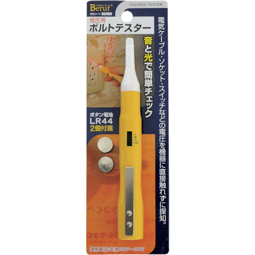 (株)イチネンアクセス ツール事業部 品番:86900 ミツトモ ボルトテスター 電池付 適用電圧:100V~600V 特長通電を音と光で簡単にチェックできます。電気ケーブル・ソケット・スイッチなどの電圧を機器に直接触れずに測定できます。用途電子機器のケーブル、ソケット、スイッチの通電チェックに。商品スペック仕様・規格適応電圧:交流100~600V電源(V):ボタン電池/LR44×2個電源:ボ