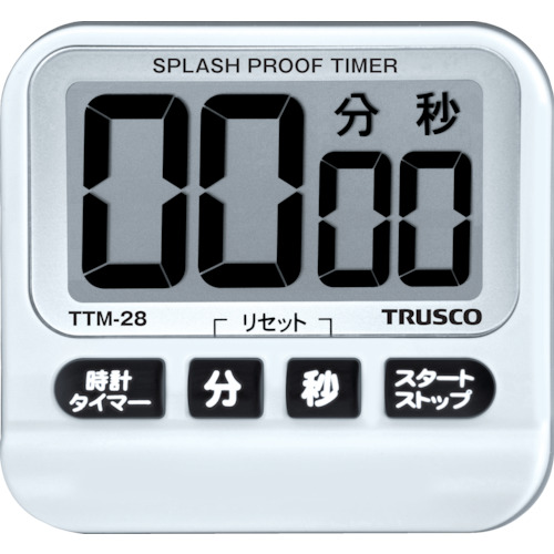 トラスコ中山(株) 品番:TTM-28 TRUSCO 防滴タイマー 特長大型液晶表示で見やすいです。大きなアラーム音ですのでわかりやすいタイマーになります。5種類の音色が選べます。防滴仕様(IPX1)、時計付(24時間制)です。濡れた手でも使える防滴仕様です。マグネット、スタンド、ストラップ用穴付きなのでお好みの場所に置けます。用途厨房等の時間管理。製造・作業工程の時間管理。商品スペック仕様・
