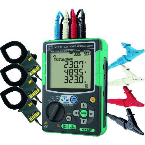 共立電気計器(株) 品番:KEW6305 KYORITSU 電力計 特長簡単・確実な電力測定を実現しました。電力測定に必要な12種類の測定が可能です。電力自由化に伴う回生電力の測定も可能です。各相の電力、力率が確認可能です。結線チェック機能で配線間違いによる測定ミスを防止します。クランプセンサ自動認識、オートレンジ機能で手早く測定開始します。1秒~1時間で記録間隔を設定可能です。解析・設定や電