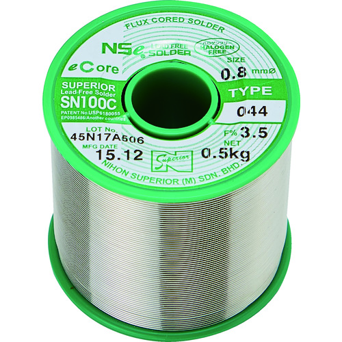 (株)日本スペリア社 品番:SN100C-044F3.5-06 スペリア 完全ハロゲンフリー 鉛フリーやに入りはんだ SN100C-044 0.6mm 特長ハロゲン化合物の意図的添加のないROL0タイプのやに入りはんだです。人体に有害な鉛を含まず地球環境に優しいSn/Cu/Ni系はんだです。用途プリント基板の後付け、修正に。商品スペック仕様・規格融点:227℃フラックス:044、JISAA級線