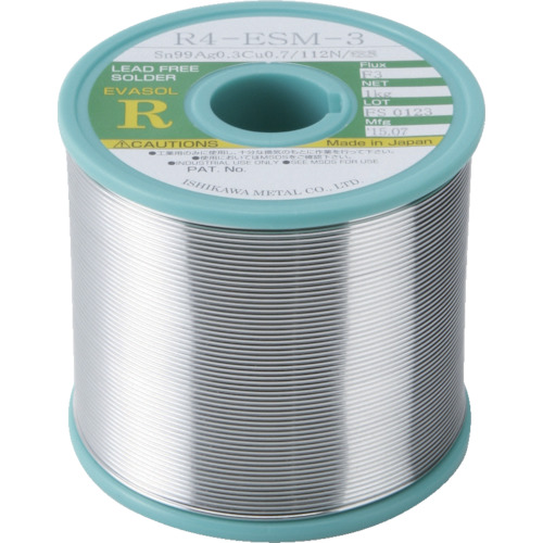 石川金属(株) 品番:R4ESM-08 石川 エバソルESM(すず99.0%/銀0.3%/銅0.7%)-0.8mm-1kg 特長低Agによるコスト削減が可能です。ステンレス(SUS304)・ニッケルなどの難母材に対してもはんだ付けが可能です。用途難母材・各種メッキ部品への配線・接続に。商品スペック仕様・規格フラックス:MIL-RA、フッ素系線径(mm):0.8融点(℃):217~226鉛フリー