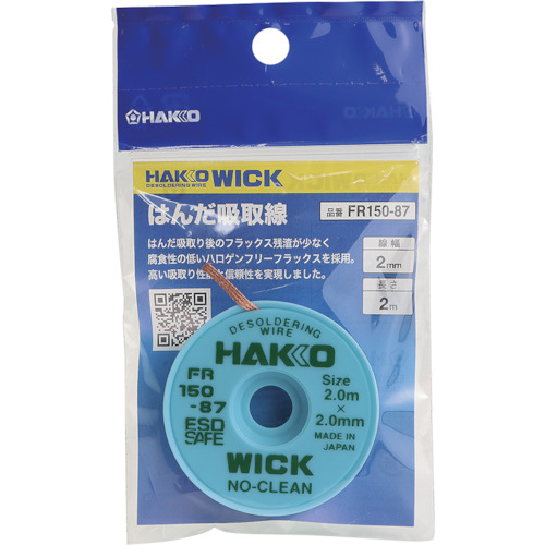 白光(株) 品番:FR150-87 白光 はんだ吸取線 ウィック FR-150 ノークリーン 2mm×2m 袋入り 特長はんだ吸取後のフラックス残渣が少なく腐食性の低いハロゲンフリーフラックスを採用しました。高い吸取り性能と信頼性の高さを実現しました。本体の劣化を防ぐためUVカットの袋やチャックを採用しました。用途スルーホールやブリッジのはんだ除去用に商品スペック仕様・規格ノークリーンタイプ幅