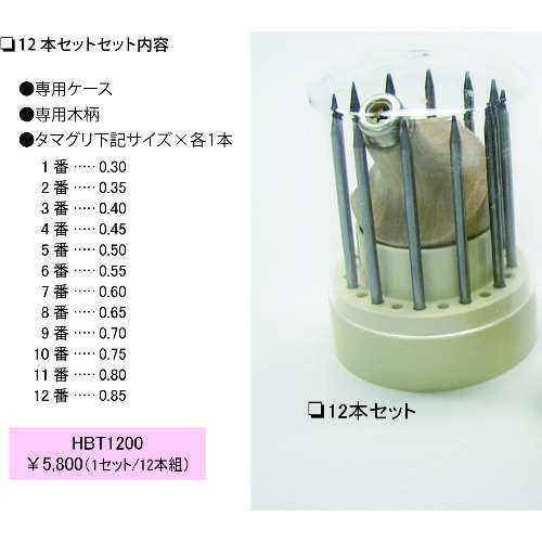 アルゴファイルジャパン(株) 品番:HBT1200 アルゴファイル タマグリ12本セット 特長カバー付のタマグリスタンドに専用木柄が付属された収納に便利なセットです。用途宝飾(爪付け)、ホビー(リベット打ち)などに。商品スペック仕様・規格サイズ:0.30・0.35・0.40・0.45・0.50・0.55・0.60・0.65・0.70・0.75・0.80・0.85mm材質-質量・質量単位78g使