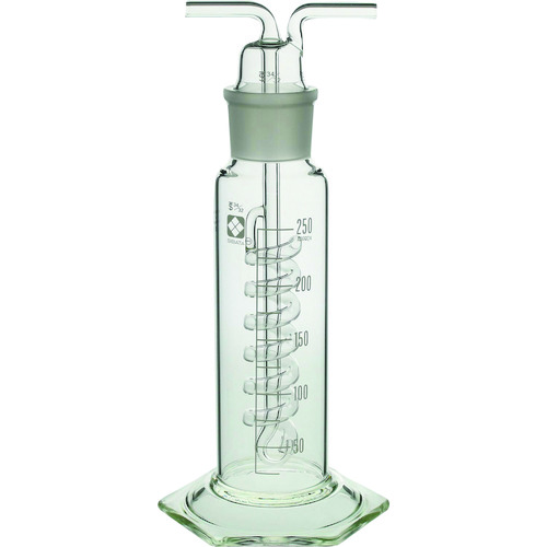 柴田科学(株) 品番:014610-250 SIBATA 洗浄びん ウォルター 250ml 特長一方の上口から入ったガスが釣り針の形状をしたガス誘導管の先端から出て、びん内のラセン状の管内を上昇し片方から出ます。その際にびん内部の液の一部も一緒に上昇するので、びん内部の液が絶えず循環することにより洗浄力は高い構造です。商品スペック仕様・規格容量mL:250記号(共通すり合わせ):34/32接続