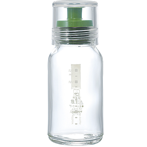 ハリオサイエンス(株) 品番:DBS-120G HARIO ドレッシングボトル スリム 120 特長振って・作って・注いで・保存ができるドレッシングボトルです。振って・作って・注いで・保存もOKです。振って作るドレッシングやタレのオリジナルレシピ付きです。ネジ口密封ボトルなので、振って作って、そのまま保存できます。ボトルは耐熱ガラス製なので、色やにおいがつきにくく、熱湯消毒や食器洗い乾燥機の使