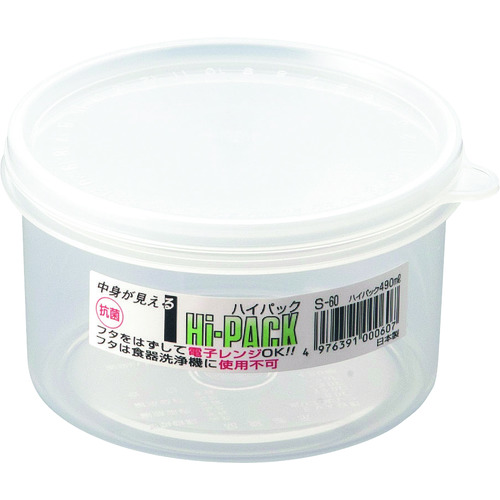 遠藤商事(株) 品番:AHI05060 TKG エンテック ハイパック 丸型 S-60 特長ハイパックサイズが豊富で用途が広い、便利な保存容器ハイパックです。材質:本体ポリプロピレン本蓋ポリエチレン耐熱温度:120℃耐冷温度-20℃※抗菌※電子レンジ対応(フタをはずして電子レンジでご使用できます。)商品スペック仕様・規格メーカー品番:S-60直径×高さ:110×66容量:490cc材質本体:ホ