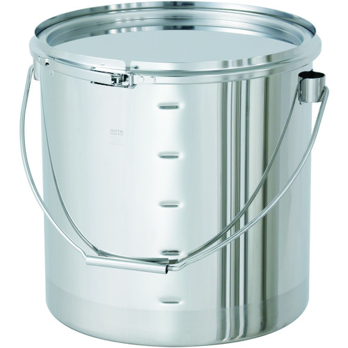 日東金属工業(株) 品番:CTLB-M-24 日東 吊り下げ式ステンレス密閉容器 目盛付(バンド式) 10L 特長粉体・液体等の一時保管や運搬用として手軽な貯蔵容器です。サイズに応じたL毎に目盛りが付いており、残量が一目でわかります。バケツのように片手で容器を持ち上げられます。バンドでワンタッチで密閉でき、内容物の飛散や異物混入を防ぎます。パッキンは食品衛生法適合品のシリコンゴムが標準です。用
