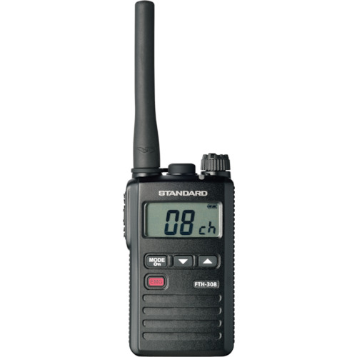 八重洲無線(株) 品番:FTH-308 スタンダード 特定小電力トランシーバー ブラック 特長超小型・軽量コンパクトボディです。単3乾電池1本で約28時間運用ができる省電力設計です。保護等級:IP67相当です。緊急状態を知らせるエマージェンシー機能付です。商品スペック仕様・規格交互通話20チャンネル+中継通話27チャンネル出力:10mW通話距離:200m(市街地)、約1km(郊外)色:ブラック