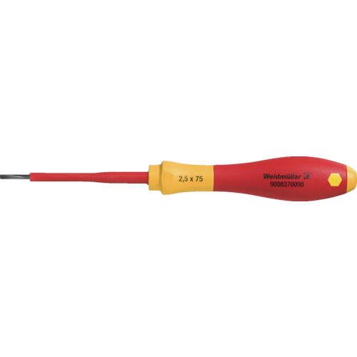 日本ワイドミュラー(株) 品番:9008370000 ワイドミュラー マイナス絶縁ドライバー SDIS 0.4X2.5X75 特長AC1000V、DC1500V対応のDINEN60900IEC900に基づく絶縁ドライバです。握りやすく、疲れにくい独自のSoftFinish(R)グリップは、効率的にトルクを伝達し、快適な作業を提供します。クロムバナジウムモリブデン鋼に独自の加工を加えた先端は耐久