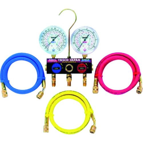 (株)イチネンTASCO 品番:TA124WH-2 タスコ R404A R407C R507A R134a用ボールバルブ式ゲージマニホールドキット 商品スペック仕様・規格マニホールド:ゲージ取付ネジ…1/8″NPT:ホース接続ポート…1/4″フレア(TA124W-1)(TA124WH-1)。高圧連成計(MPa):0.1~3.8MPa(TA141C-1)チャージホース:150cm(赤・青・黄)(