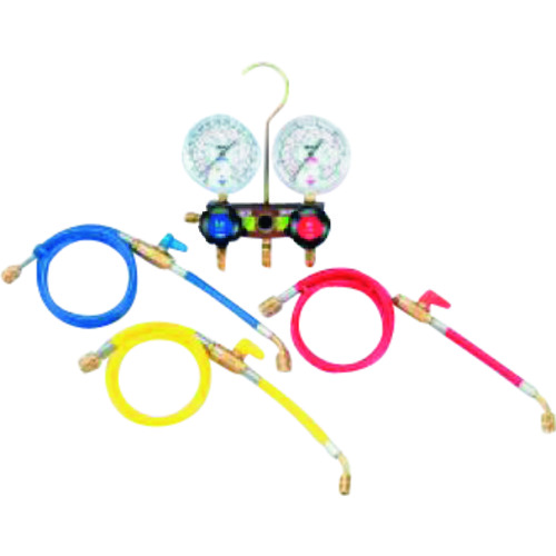 (株)イチネンTASCO 品番:TA124V-2 タスコ R404A R407C R507A R134a用サイトグラス付ゲージマニホールドキット 商品スペック仕様・規格マニホールド:ゲージ取付ネジ…1/8″NPT:ホース接続ポート…1/4″フレア(TA124A-1)(TA124AH-1)。高圧連成計(MPa):0.1~1.8MPa(TA141C)チャージホース:150cm(赤・青・黄)(TA1
