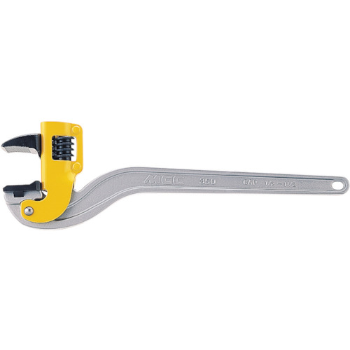 (株)MCCコーポレーション 品番:CWPAL600 MCC コーナーレンチ アルミ被覆管専用600 特長被覆鋼管・継手などの締付けに最適です。パイプレンチの機能に加え、コーナー部・溝の中など狭所の配管作業に最適です。ポリ・塩ビ系被覆にピッタリフィットするきめ細かい歯が被覆の傷を最小に抑え、面倒な後処理不要です。大きなアゴ・歯部が確実にパイプをくわえる被覆鋼管専用設計です。用途被覆鋼管・継手な