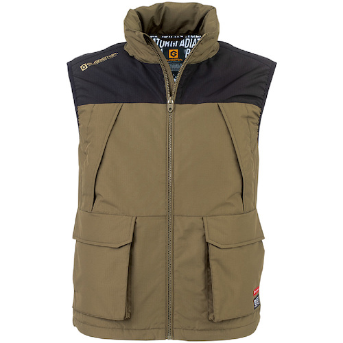 (株)岡潮 品番:G-8049-TAN-KHAKI-3L_61480001 岡潮 電熱ベスト+モバイルバッテリー10,000mAhセット G-8049 タンカーキ 3L 特長電熱線にマイクロカーボンファイバーを採用し、熱の伝導性を高めるとともに、安定した発熱を実現したアウタータイプの電熱ベストです。ウェア自体が発熱することで、これまでの防寒着にはない身体の芯から温まる理想の電熱ベストです。扱い