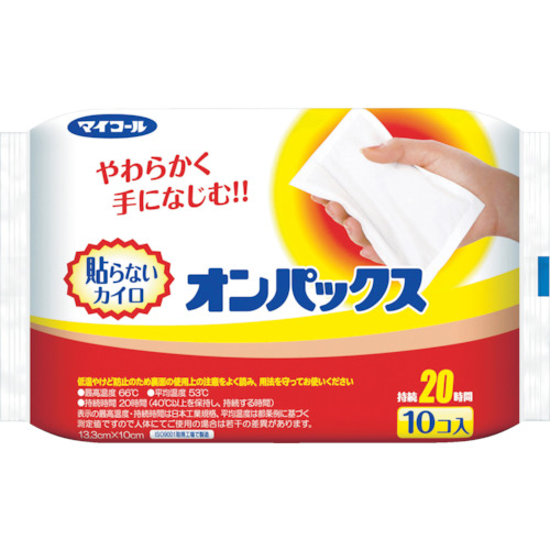 エステー(株) 品番:OP20H10P266 エステー 貼らないカイロオンパックス20h 10P 特長揉まずに早く温まり、長時間安定した温度が持続します。商品スペック仕様・規格最高温度(℃)する:66℃平均温度:53℃持続時間:20時間貼れないタイプカイロサイズ横×縦(mm):128×95袋入数(枚):10材質-質量・質量単位568g使用条件-注意事項-セット内容・付属品-製造国日本小箱入数小