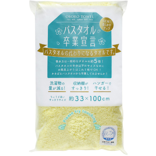 (株)グリーンクロス 品番:6300029740 グリーンクロス バスタオル卒業宣言 ペールレモン 特長バスタオルの代わりになるタオルです。「甘撚りのコーマ糸」を使用し、おぼろタオル独自の晒し技術によってボリューム感と軽量感、吸水性を実現しました。一般的なバスタオルの1/2以下の大きさで約5倍の吸水力を有しています。日本アトピー協会推薦品です。用途日々の生活に。商品スペック仕様・規格長さ(cm