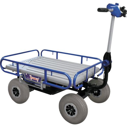 (株)筑水キャニコム 品番:EJ20V CANYCOM 電動マルチカート“ついてくるか~い” 特長どこでも手軽に楽に運搬ができます。タイヤ痕が残らないグレータイヤです。ノーパンクタイヤを採用しています。電磁ブレーキの採用、デッドマン機能により、手を離すと停止します。ワンタッチロックサイドフレームを採用で小回りが抜群です。一般家庭の電源で充電出来ます。各パーツに分解ができますので、車のトランク等