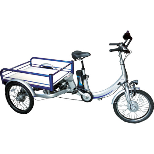 (株)筑水キャニコム 品番:EJ06B CANYCOM 電動アシスト運搬車三輪駆動静香(銀青) 特長電動アシスト付運搬車です。公道走行可能な運搬車です。デフ付なので小旋回が可能です。回生モータにより坂道で充電します。前輪アシストモータ+後輪ペダル駆動の3輪駆動により、後輪にかかる走行負荷を前後輪に分散します。登り坂も座ったままで、楽々走行できます。Wサスペンション搭載で、荷物への衝撃を軽減。凹