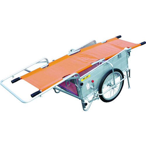 昭和ブリッジ販売(株) 品番:SMC-1BST 昭和 折りたたみリヤカー アルミハンディキャンパー ブレーキ・スタンド・担架付 1740×670×630 特長SMCシリーズをベースに、災害時に要援護者を安全に搬送するための、担架と頑丈な担架ストッパー金具とワンタッチ式駐車ブレーキと安全スタンドを装備しました。ワンタッチで折りたためる新感覚のリヤカーです。オールアルミ製のため、サビがなく、軽量で