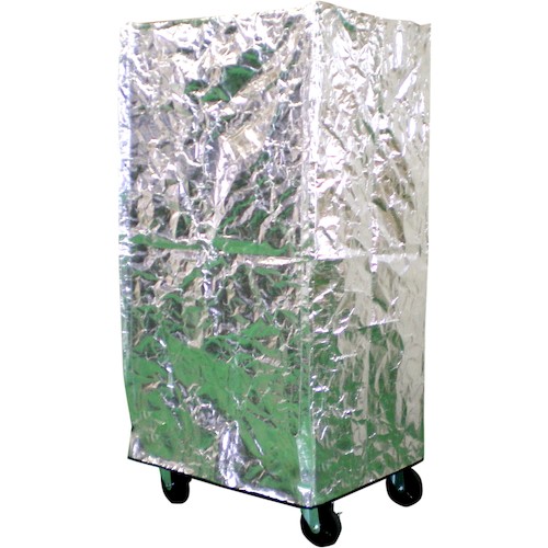 (株)サンユー印刷 品番:KTF9070150 サンユー印刷 保冷カゴ台車カバー(キープサーモフィルム) 900mm×700mm×1500mmH ファスナー2か所付 特長輻射熱97%カットによる特殊遮熱による保冷カバーです。被せるだけでトラック輸送、エアー輸送、海上コンテナ輸送において常温輸送を可能とします。キープサーモアイスなどの保冷剤(蓄冷剤)やドライアイスと併用することで冷蔵輸送などの用