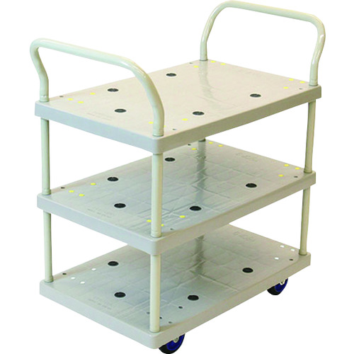 浅香工業(株) 品番:183486 金象 プラキャリー 3段式小 フットブレーキ付 特長ハンドル固定式樹脂製台車3段式フットブレーキ付用途工場、倉庫、店舗での運搬作業使用備品に商品スペック仕様・規格樹脂製台車3段式フットブレーキ付使用時外寸法 全長800×全幅455×全高860mm車輪径 100mm積載重量 150kg積載面高さ 145mm(下段) 385mm(中段) 635mm(上段)積載面