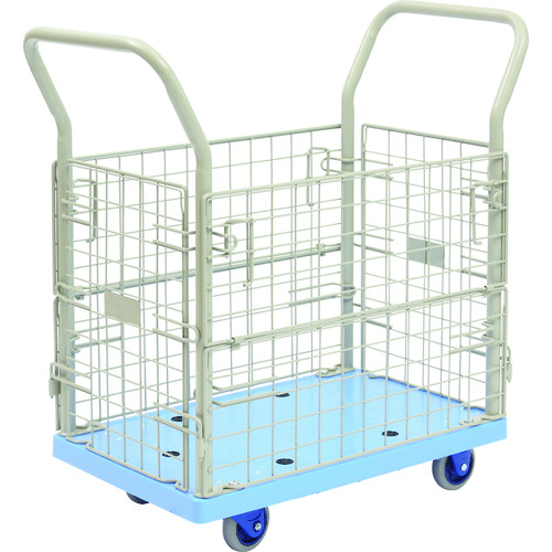 金沢車輛(株) 品番:NP-107GS 金沢 小型環境静音樹脂台車 金網付 特長デッキ及びキャスターヨークは樹脂製のため錆びる心配がありません。ハンドルはより強度の強い固定式です。ハンドルの塗装は錆にも強い紛体塗装仕上げです。環境省基準値40dB適合の静音キャスターを使用しています。網は長手側両サイドを開閉することができ、荷物の出し入れに便利です。安全・安心・高品質の純日本製です。用途運搬用に