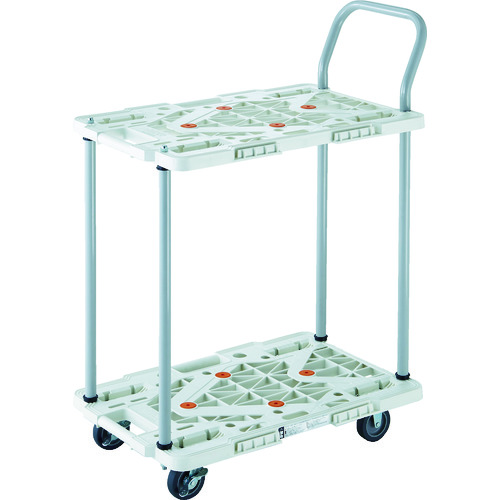トラスコ中山(株) 品番:MPK-6024S-B TRUSCO 樹脂製台車 2段式ルートバン 600X400 ハンドル付 ストッパー付 青 特長荷台は堅牢なリブ構造です。薬品や溶剤にも侵されにくく耐久性に優れています。台上に滑り止め用ゴムが4ヵ所ついています。商品スペック仕様・規格組立式自在ストッパー付キャスター、固定キャスター各2個上段均等荷重:30kg下段均等荷重:70kg2段式タイプハン