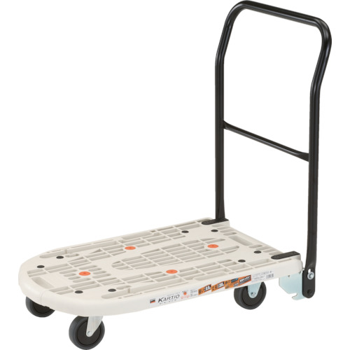 トラスコ中山(株) 品番:MPK-720F-W TRUSCO カルティオフラット 回転 780X490 白 特長ハンドルは回転してキャスター側にコンパクトに収納できます。平台車と手押し台車の1台2役で使用できます。用途運送業、工場内の作業。物流倉庫内での運搬作業。商品スペック仕様・規格完成品折りたたみ回転ハンドルタイプ自在キャスター、固定キャスター各2個滑り止めゴム:天板中央部に大4個、キャス