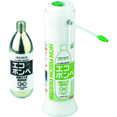 (株)エンジニア 品番:ZC-35 エンジニア ノンフロンダスター エコボンベ 特長石油産業から排出される炭酸ガスを有効利用しています。新開発ノズルにより大気中の空気を巻き込み、噴射量を倍増します。ボンベは簡単に取り替えが可能なカートリッジ式、本体は繰り返し使用可能です。地球温暖化係数1/1300(代替フロン:HFC134a比)不燃性なので引火の危険が無く、安心安全です。用途精密機器の掃除やメ