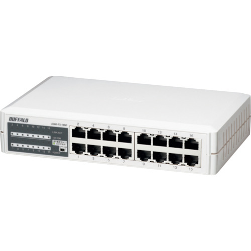 (株)バッファロー 品番:LSW3-TX-16NP バッファロー 10/100M スイッチングハブ プラスチック筐体/電源内蔵モデル 16ポート 特長設置場所をとらないコンパクトで軽いプラスチック筐体です。ネットワークにループ構成を検知したらお知らせする「ループ検知」機能搭載です。静音性にすぐれたファンレス設計です。トラッキング防止加工済電源コードを採用しています。「おまかせ節電」機能により自