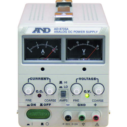 (株)エー・アンド・デイ 品番:AD8735A A&D 直流安定化電源トラッキング動作可能アナログ・メーター方式 特長定電圧源、定電流源の2つの使い方ができます。ノイズやリップルの少ない優れた負荷安定性です。トラッキング動作(マスター・スレーブ動作)が可能です。用途研究開発:電気/電子実験、試作基板の電源供給に。メンテナンス:電気・電子機器の保守、点検、修理に。学校/大学:学生の電気・電子実験