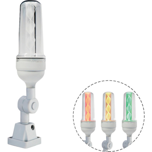 日機(株) 品番:NLA70-3B1DS-RYG 日機 導光柱式アラームライト NLA70シリーズ 特長赤・黄・緑の3色を導光柱を用いて発光するアラームライトです。導光柱による発光で、グローブ全体より光を放出することができ、全方向から容易に表示確認が可能です。独自設計の保護回路を設け、突入電流やサージ、瞬時停電に対応しており、且つ震動試験、絶縁抵抗試験をクリアした安全設計です。可倒式の取付台座