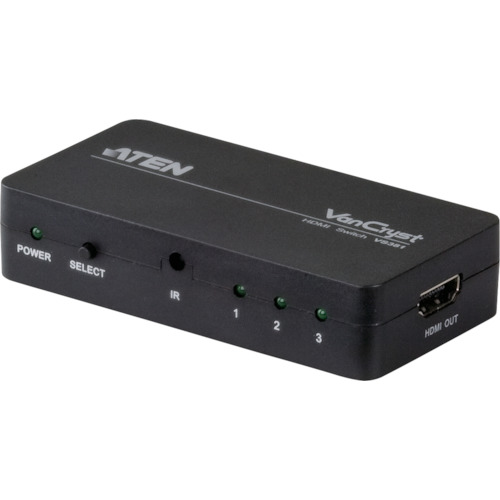 ATENジャパン(株) 品番:VS381 ATEN ビデオ切替器 HDMI / 3入力 / 1出力 特長最大3台のHDMIソースデバイスを1台のHDMIディスプレイに接続/表示することが可能です。リモコンやフロントパネルのプッシュボタンで3台のHDMIソースデバイス(例:DVD、衛星放送受信機等)を簡単に切り替えることが可能です。解像度-HDTV解像度480p、720p、1080i、1080p