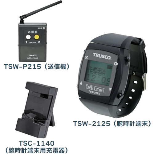 トラスコ中山(株) 品番:TSW2125-KIT TRUSCO “ヨベルウォッチ” スターターキット 特長すぐに使えるお得な基本セットです。あとから腕時計端末や送信器・中継器などの機器の追加も可能です。信号受信やボタン操作で、離れた場所にいる人に設定した定型文を通知できます。受信機同士で定型文のやり取りもできます。情報着信時に振動という体感で知らせるために情報着信を見逃しません。画面上に情報内