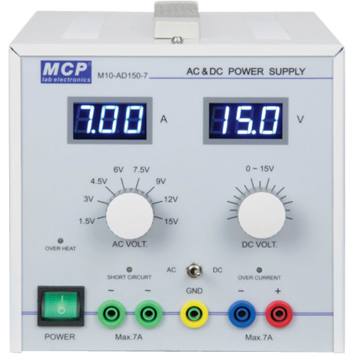 上海MCP社 品番:M10-AD150-7 上海MCP 直流&交流安定化電源 M10-AD150-7 特長ACおよび安定化DC出DC連続調整可能およびACステップバイステップ電圧および電流表示用のLEDメータDC出力の電流制限保護AC出力の短絡保護デバイスの過熱保護商品スペック仕様・規格DC出力:出力電圧:0~15V、出力電流:7A、負荷変動率:5mV、電源変動率:2mV、リプル:2mVAC出