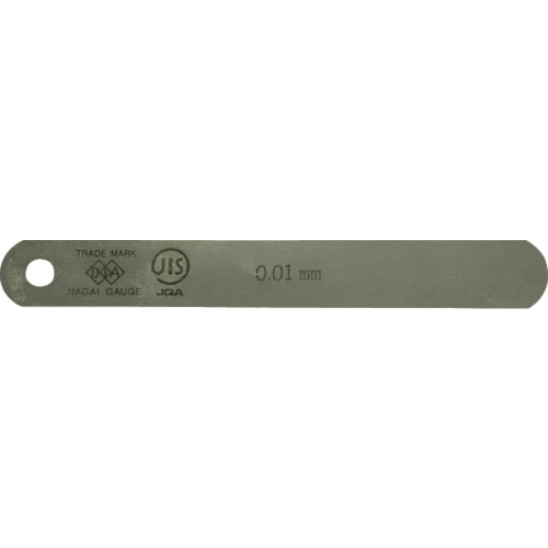 (株)永井ゲージ製作所 品番:100A0.01 DIA JIS規格すきまゲージリーフ0.01X100A型 特長他の測定器では測り得ない微細な二平面の間隔を簡単にかつ正確に検査することができます。自動車や、電動機、発動機関のピストンやシリンダ部の間隔測定には欠くことのできない測定具です。焼き入れ品です。用途すき間の測定。商品スペック仕様・規格JISB7524規格品リーフ形状:A長さ(mm):10