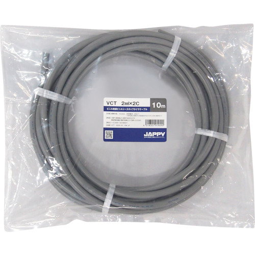 因幡電機産業(株) 品番:VCT 2SQX 2C 10M JP JAPPY キャブタイヤケーブル 特長必要なときに必要な量だけお求めできる短尺サイズです。用途工場や工事現場などに使用する600V以下の移動用電気機器の電源や配線などに。商品スペック仕様・規格導体構成:37本/0.26mm導体外径:1.8mm絶縁体標準厚:0.8mmシース標準厚:1.8mmシース色:灰色仕上外径:10.4mm使