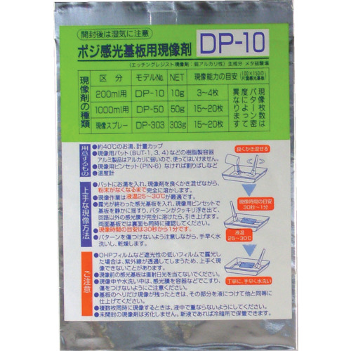 サンハヤト(株) 品番:DP-10 サンハヤト ポジ感光基板用現像剤 10g 特長露光後のポジ感光基板を確実に現像できます。現像処理の必需品です。開封しない限り劣化しないので、保存に最適です。30~31℃に解かして使います。作業目安はハガキ大基板3枚です。商品スペック仕様・規格粉末タイプ感光基板専用現像剤適用:現像剤(200cc用)材質:メタケイ酸ソーダ材質-質量・質量単位12g使用条件-注意