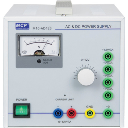 上海MCP社 品番:M10-AD123 上海MCP 直流&交流安定化電源 M10-AD123 特長ACおよび安定化DC出DC連続調整可能電気的に絶縁されたAC出力電圧表示用アナログメータDC出力の電流制限保護商品スペック仕様・規格DC出力:出力電圧:0~12V、出力電流:3A、負荷変動率:5mV、電源変動率:1mV、リプル:1mV、保護:過電流、表示精度:2.5%AC出力:出力電圧:3V,6V