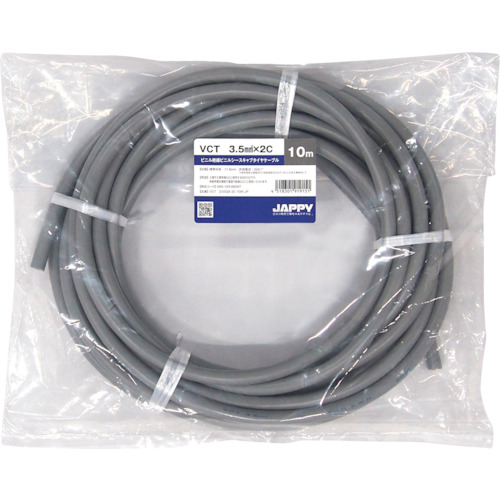 因幡電機産業(株) 品番:VCT 3.5SQX 2C 10M JP JAPPY キャブタイヤケーブル 特長必要なときに必要な量だけお求めできる短尺サイズです。用途工場や工事現場などに使用する600V以下の移動用電気機器の電源や配線などに。商品スペック仕様・規格導体構成:45本/0.32mm導体外径:2.5mm絶縁体標準厚:0.8mmシース標準厚:1.8mmシース色:灰色仕上外径:11.8m