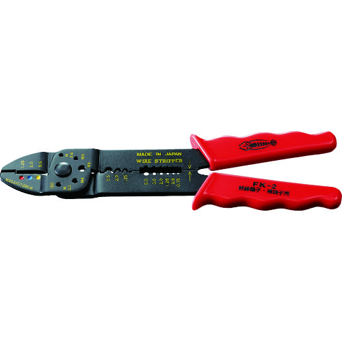 (株)ロブテックス 品番:FK2 エビ 電装圧着工具(絶縁端子用/裸端子用/P.B形スリーブ用) 特長絶縁圧着端子・裸圧着端子・P.Bスリーブの圧着、ボルト・電線の切断、電線の被覆むきがこれ1丁でできます。用途自動車整備、配線などの端子圧着に。絶縁圧着端子・裸圧着端子・P.Bスリーブの圧着、ボルト・電線の切断、電線の被覆むき商品スペック仕様・規格全長(mm):235圧着端子((MM2))裸端子
