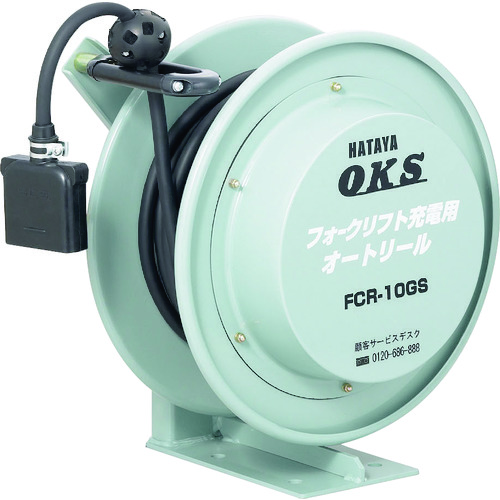 (株)ハタヤリミテッド 品番:FCR-85GS OKS フォークリフト充電用オートリール 特長バッテリー式フォークリフトや無人自走台車の充電に最適なケーブルリールです。自動巻なので充電後のケーブルが床に散乱することがなく、誤って踏んでプラグを破損することがありません。整理整頓・作業環境改善の推進を重視されるISO認証事業所にもおすすめします。本体はタフなスチール製です。強固なガイドローラー付で