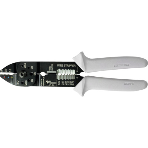 (株)ツノダ 品番:AP-04 TTC 電工万能ペンチ AP-04(絶縁端子用) 特長これ1本で電気配線に必要な5つの機能(絶縁端子圧着、ボルト・ネジの切断、イグニッションターミナル圧着、ワイヤーカッター、ワイヤーストリッパー)を装備しています。手に優しいエラストマーグリップを採用しています。用途自動車や電子機器などの配線の各種圧着端子の圧着、小ネジの切断に。商品スペック仕様・規格切断能力:軟