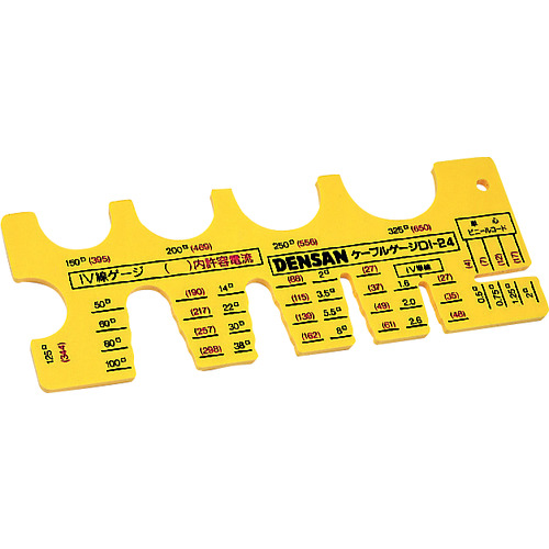 ジェフコム(株) 品番:DI-24 デンサン ケーブルゲージ 電線測定にはコレ!!特長1枚で325(MM2)まで24種類の電線を測定できます。コンパクトで使いやすいケーブルゲージです。用途ケーブル仕上外径の測定に。商品スペック仕様・規格測定電線種別及び測定範囲 IV線(600V単線):1.6~2.6mm IV線(600Vより線):2~325(MM2) 単心ビニールコード:0.5~2(MM2)幅