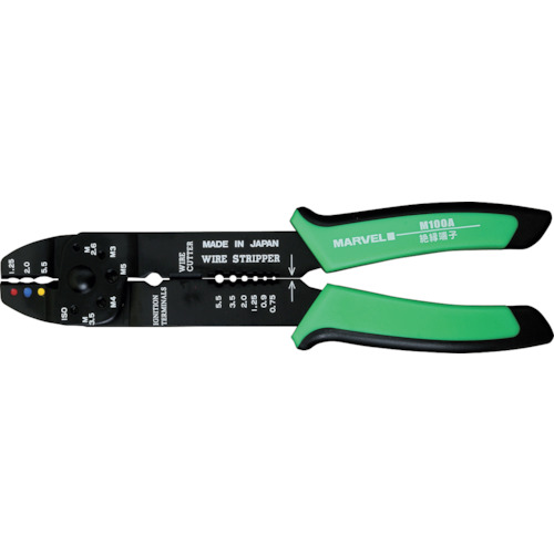 (株)マーベル 品番:M100A マーベル 電工ペンチ 特長この1丁で「圧着」「ケーブル切断」「小ねじ、ボルトの切断」「皮むき」の作業が可能な機能になってます。用途自動車、機械、電気機器などの配線作業に。商品スペック仕様・規格全長(mm):225圧着端子:絶縁端子圧着端子((MM2)):1.25、2.0、5.5圧着端子((MM2))絶縁被覆付閉端接続子用:1.25、2.0、5.5小ねじ、ボルト