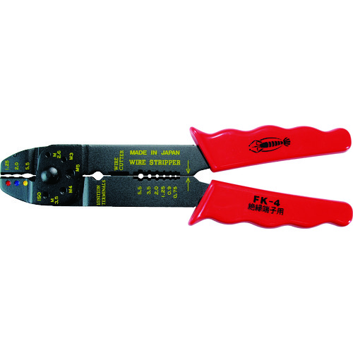 (株)ロブテックス 品番:FK4 エビ 電装圧着工具(絶縁端子用) 特長絶縁圧着端子の圧着、ボルト・電線の切断、電線の被覆むきがこれ1丁でできます。用途自動車整備、配線などの端子圧着に。絶縁圧着端子の圧着、ボルト・電線の切断、電線の被覆むき商品スペック仕様・規格全長(mm):220圧着端子((MM2))絶縁端子用:1.25、2、5.5グリップ色:赤材質本体:スチールグリップ:樹脂質量・質量単位