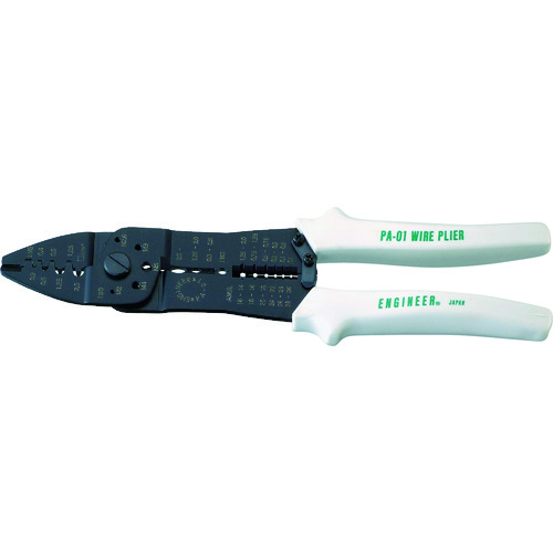 (株)エンジニア 品番:PA-01 エンジニア コードプライヤー(裸端子/絶縁端子/接続端子) 245mm 特長精密配線作業に必要な各種の機能をコンパクトにまとめた多機能型圧着ペンチです。小ねじの切断や被覆剥きも可能です。本体は耐久性に優れた高炭素鋼です。手によくフィットするクッショングリップです。用途自動車の整備、工場のメンテナンス、電話の配線、各種ホビー、オーディオ、テレビ、その他家電機器