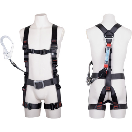 藤井電工(株) 品番:TH506CR93SVOTDGLR23BX ツヨロン フルハーネス飛燕 コルトリトラ Lサイズ 特長胴ベルト部に道具取り付けスペースを幅広く確保したY型のフルハーネスです。腿部は左右が独立しているので束縛感が少なく、動きやすさを高める水平型腿ベルトです。ベルトの長さの調節範囲を広く取っているため、夏服・冬服でもピッタリ装着が可能です。織ロープ長さが常に最短となる常時巻取式