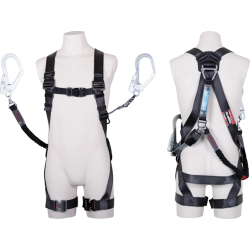 藤井電工(株) 品番:TH504-CRNV93SVOT-DG-BKM-2R23BX ツヨロン 黒影ハーネス 特長腿部は左右が独立しているので束縛感が少なく、動きやすさを高める水平型腿ベルトです。付属の固定具を使ってお手持ちの胴ベルトを取り付けられます。常時巻取タイプで軽量・小型なコルトリトラと伸縮自在なノビロンランヤードのツインランヤード付きです。用途装備体重100kgまでの方用です。第一種シ